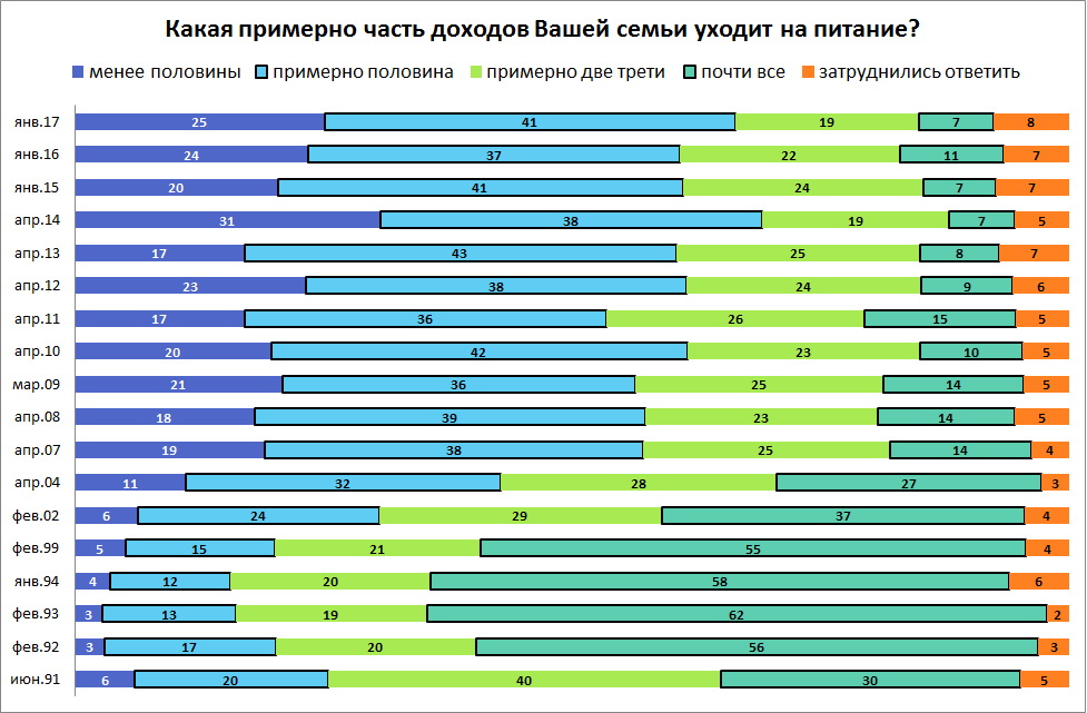 При цьому 79% респондентів повідомили, що ціни на Росії за останній рік піднялися відо 15% до 100% і більше, інші вважають, що інфляція була нижче 15%, або не змогли відповісти.