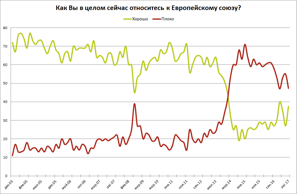 Погано ставляться до Європейського Союзу 48% респондентів, добре – 38%.