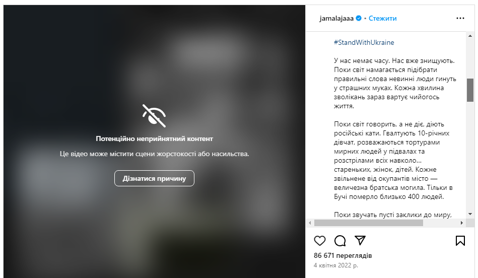 Приводом для кримінальної справи став допис співачки про звірства і воєнні злочини росіян, зокрема у Бучі, який вона опублікувала 4 квітня 2022 року у своєму Instagram. У московській прокуратурі заявили, що Джамала написала «завідомо неправдиву» інформацію про дії російської армії в Україні, а також «керувалася мотивами національної ненависті» та «ненависті щодо соціальної групи «військовослужбовці ЗС РФ».
