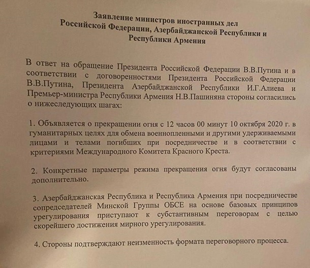 Також Азербайджан і Вірменія повернуться до переговорів в Мінському форматі для мирного врегулювання ситуації в Нагірному Карабасі. Формат переговорів не зміниться.
