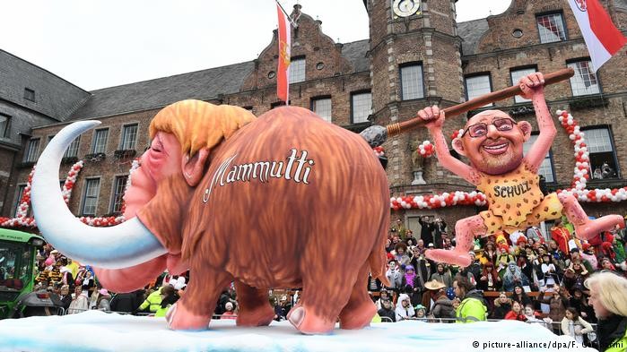 Голова СДПН Мартін Шульц, якого на сатиричному візку зобразили у вигляді печерної людини, встромляє списа у канцлера ФРН Ангелу Меркель, яку автори бачать в образі мамонту. За даними останніх опитувань, соціал-демократи на чолі зі своїм кандидатом на посаду канцлера Шульцем обігнали за популярністю партію Меркель.