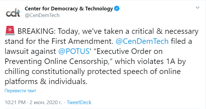 У CDT розцінили дії Трампа, як "пряму атаку на свободу слова, гарантовану першою поправкою Конституції США.