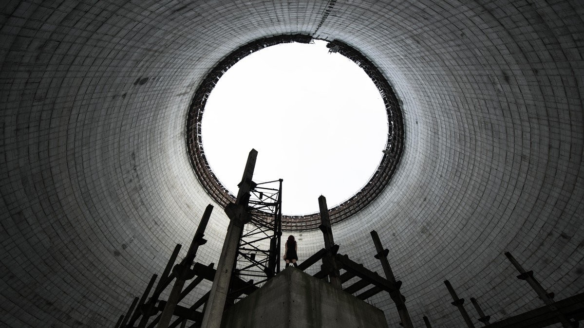 Всередині недобудованої охолоджувальної вежі на безлюдній території Чорнобильської станції.