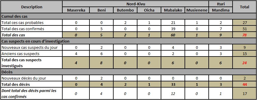 "Ебола. Ситуація станом на четвер, 16 серпня 2018 року: загалом 78 випадків, включаючи 51 підтверджених і 27 ймовірних. 24 підозрілих випадків знаходяться під наглядом", - розповіли МИЗ ДРК 17 серпня.