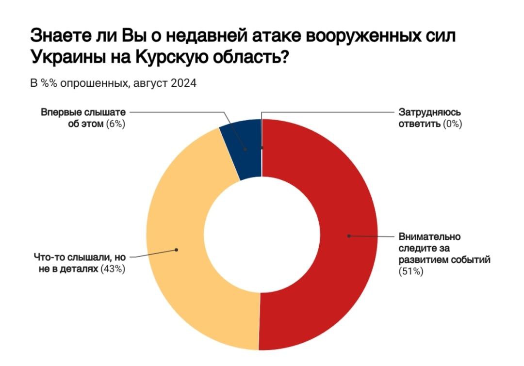 Опитування "Левада-Центру" показало, що 94% росіян знають про операцію ЗСУ у Курській області. В результатах дослідження йдеться про те, що майже половина з них, а саме 46%, "щось чули" про неї, "але не в деталях. Проте більшість все ж уважно відстежують розвиток подій, таких 51%. Ще 6% нічого про наступ не знають.