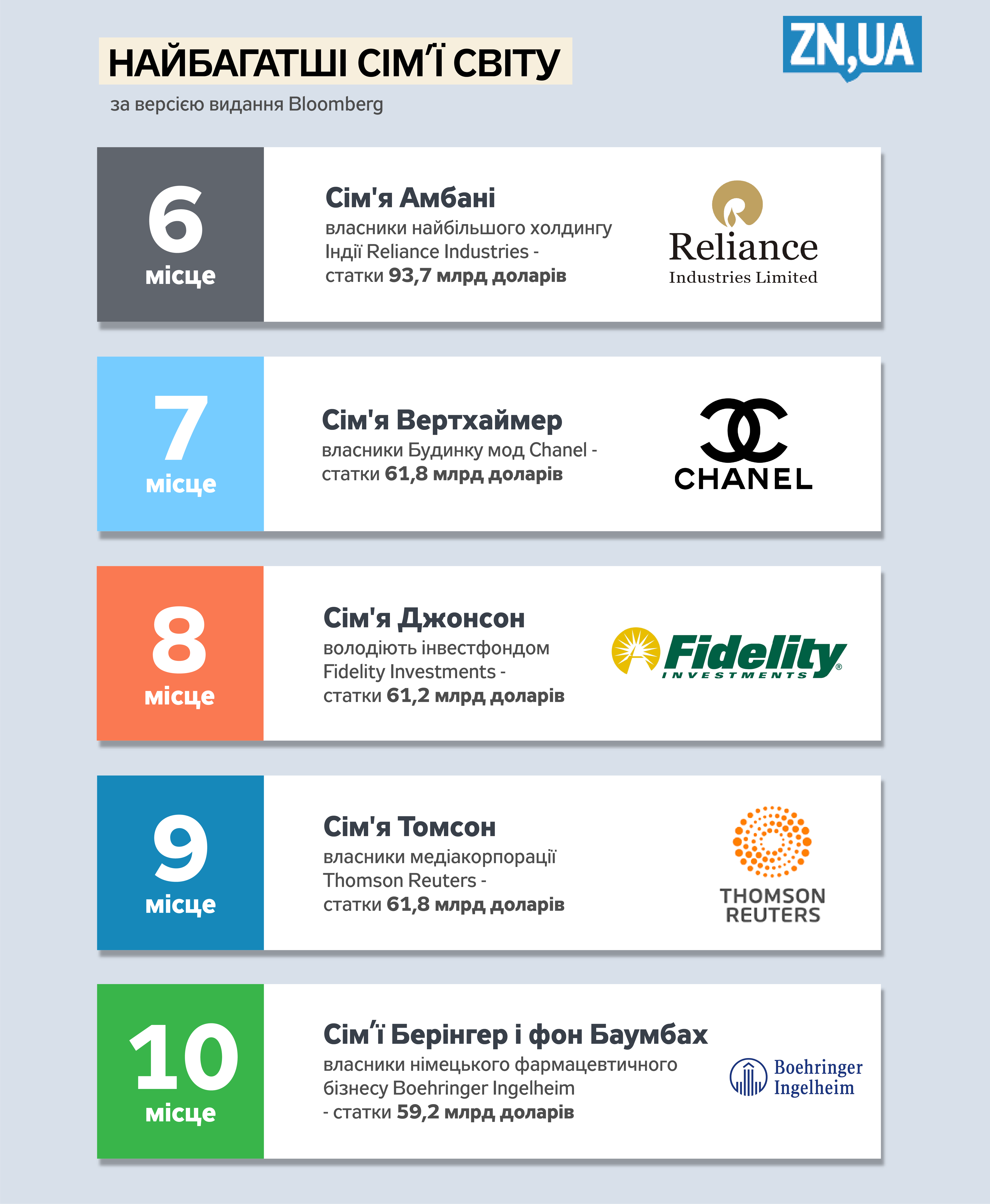 - Сім'я Вертхаймер (власники Будинку мод Chanel) - статки 61,8 млрд доларів;
