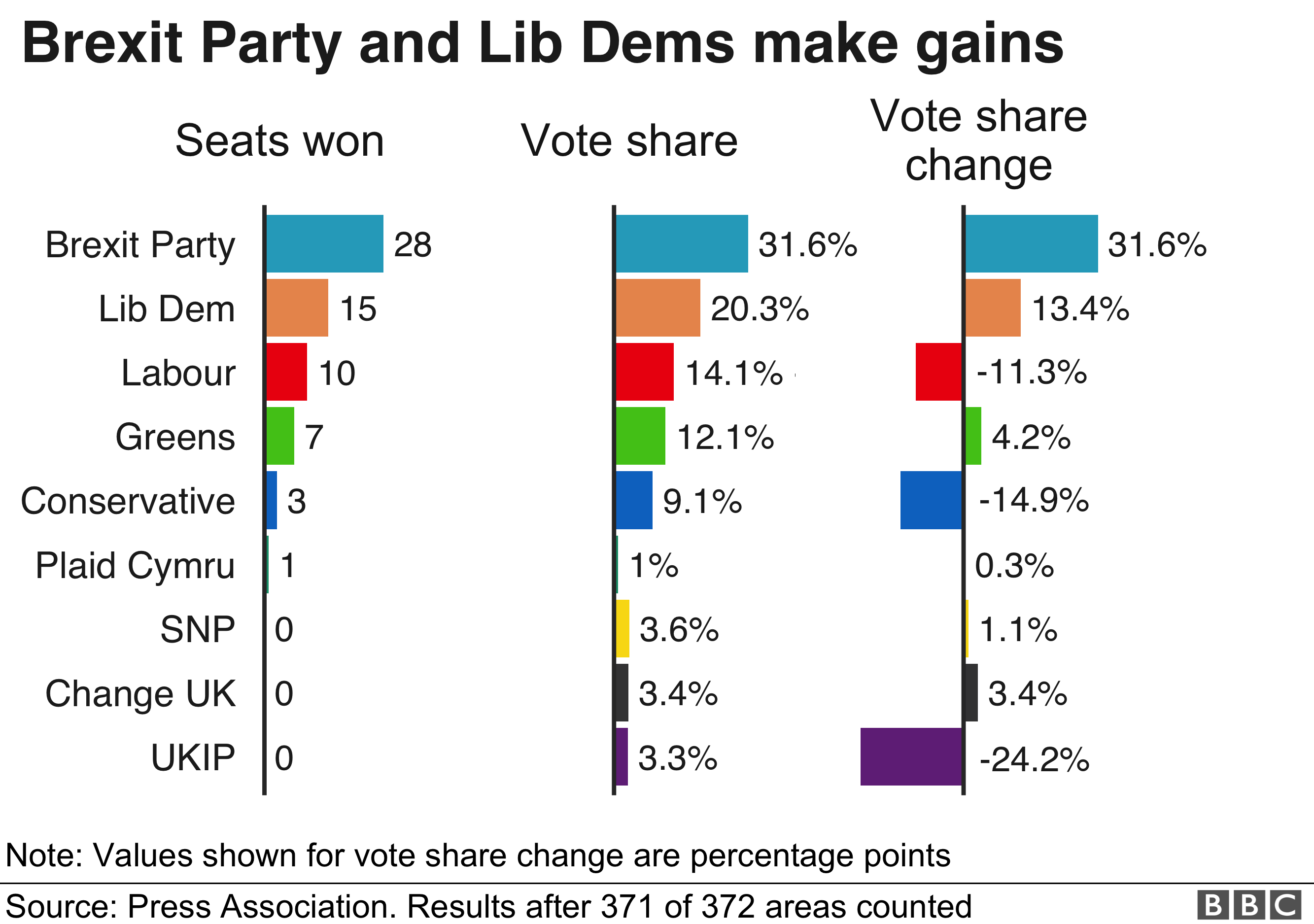 Наразі визначилися 64 обраних депутата Європарламенту з 73, що припадають на Британію. З цього числа 28 мандатів отримує Партія Brexit, 15 - ліберал-демократи, 10 - лейбористи, сім - зелені, три - консерватори і один - валлійська партія Plaid Cymru.
