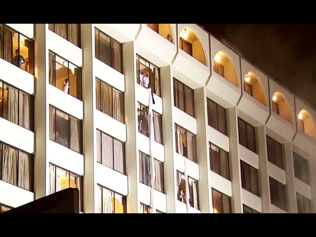 Рятуючись від вогню, люди намагалися вибратися з готелю через вікна, використовуючи простирадла.
