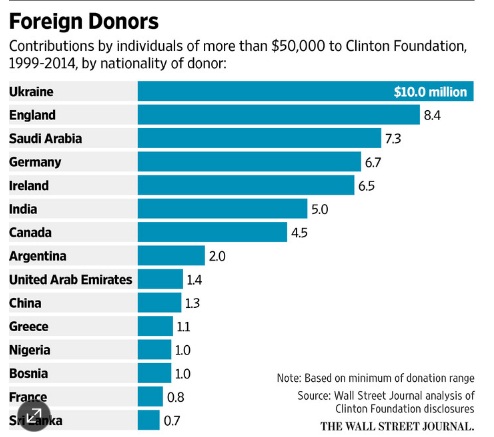 Як пише інше американське видання The Wall Street Journal, одні з найбільш рекордних сум (понад 25 млн доларів) були пожертвувані в Фонд Клінтона сімома різними організаціями, зокрема Фондом Білла і Меліси Гейтс, UNITAID та іншими. Лідерами серед іноземних донорів Clinton Foundation є представники "бідної" європейської країни – України. Так, за 15 років (до 2014 року) на допомогу семи Клінтон було спрямовано 10 млн доларів.