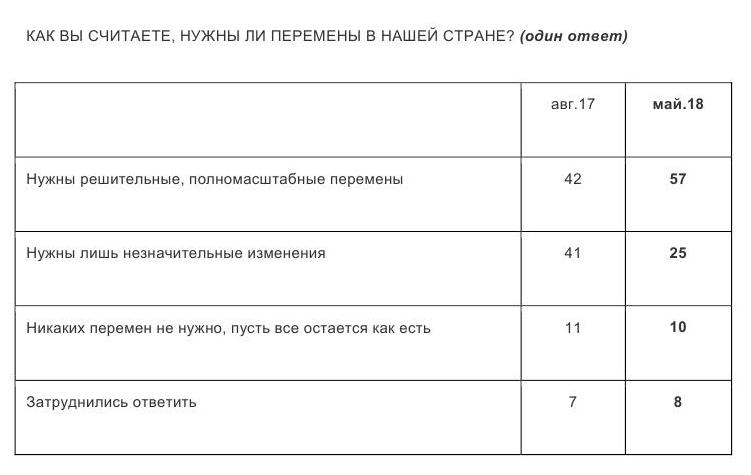 Частка опитаних, які дотримуються думки про необхідність рішучих змін у країні, зросла за рік з 42% до 57%.