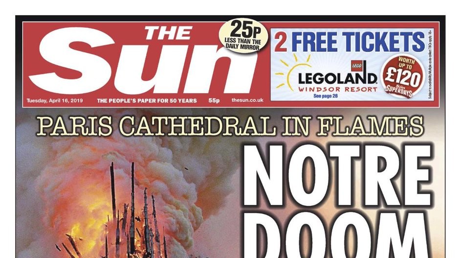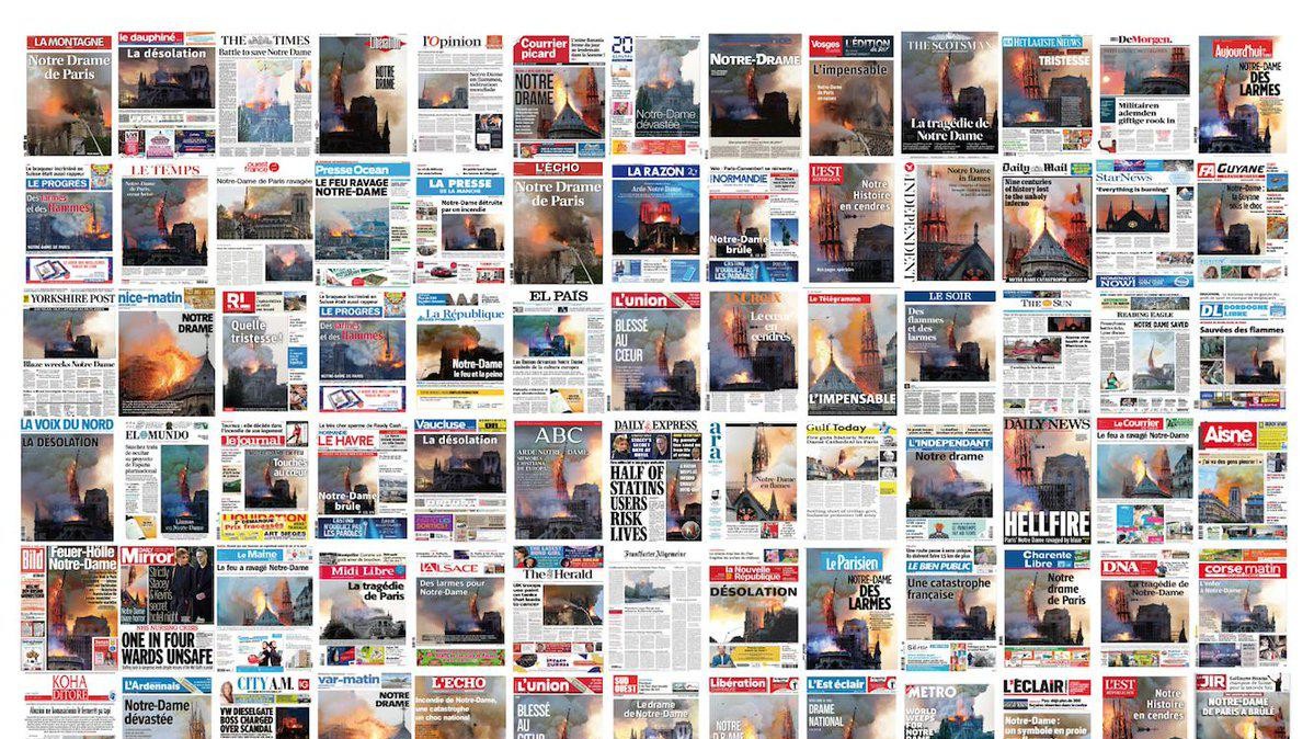 Шеф-редактор Le Journal du dimanche Сериль Петі (Cyril Petit) опублікував у своєму твіттері колаж з обкладинками новинних видань усього світу, які помістили на перші сторінки фотографії палаючого собору.