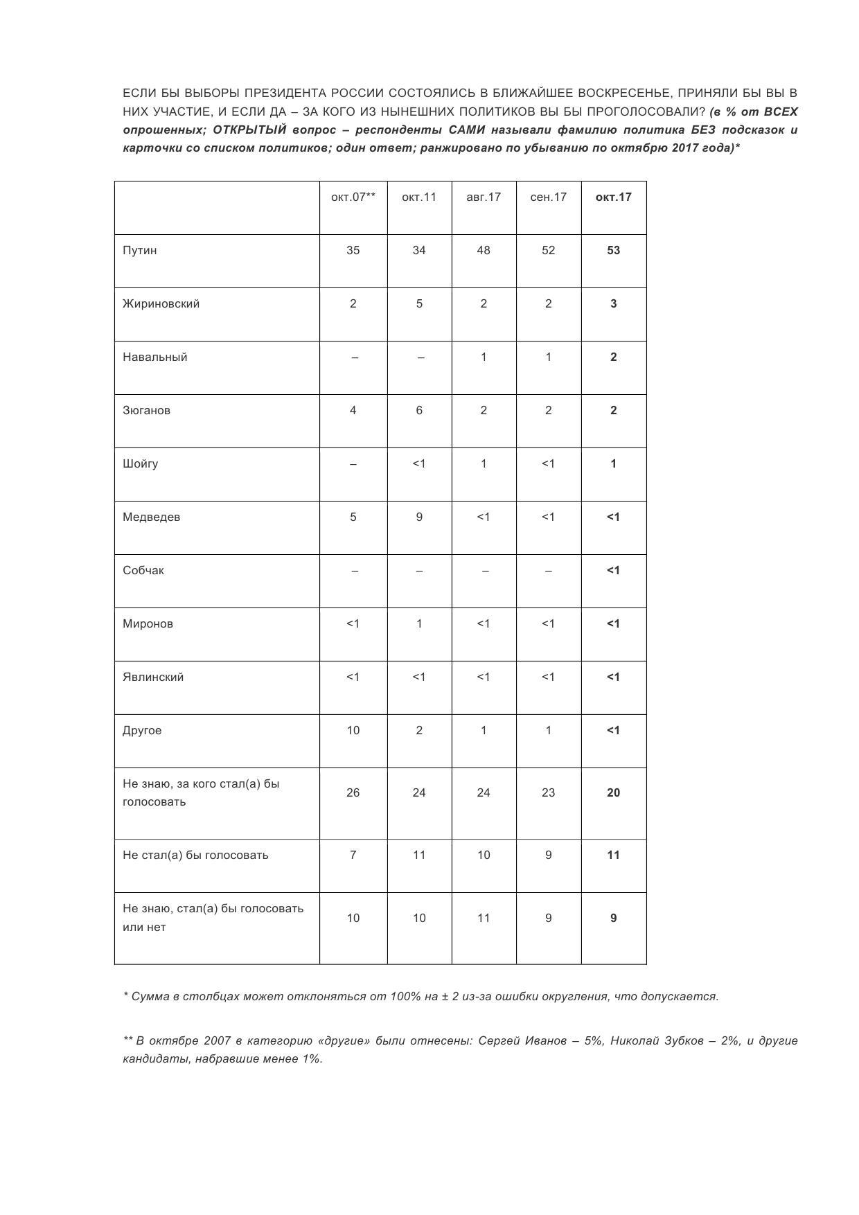 При цьому 53% опитаних в цілому по вибірці (або 66% від тих, хто був готовий голосувати на момент опитування) віддали б свій голос за Володимира Путіна.