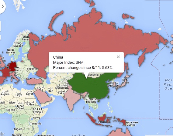 Період впливу девальвації юаня на економіки світу був визначений з 8 по 11 серпня. Так, трохи "просіли" показники в США і Канаді (індекс Доу-Джонса -1,1 % і OSPTX -1,57%). Саудівська Аравія "постраждала" (TASI) на -1,7%, Індія (SENSEX) -1,38%, Японія (NI225) -1,01%. Більш насичений червоний відтінок у таких "потерпілих": у Туреччині (XU100) -2,21%, Італії (FTSEMIB) -2,38%, у Бразилії (IBOV) -2,88%, Австралії (XJO) -2,03%. Більш серйозний рівень впливу на економіку у Росії (RTS.RS) -3,25%, Індонезії (IDDOW) -3,96%, Іспанії (IB) -3,29%.