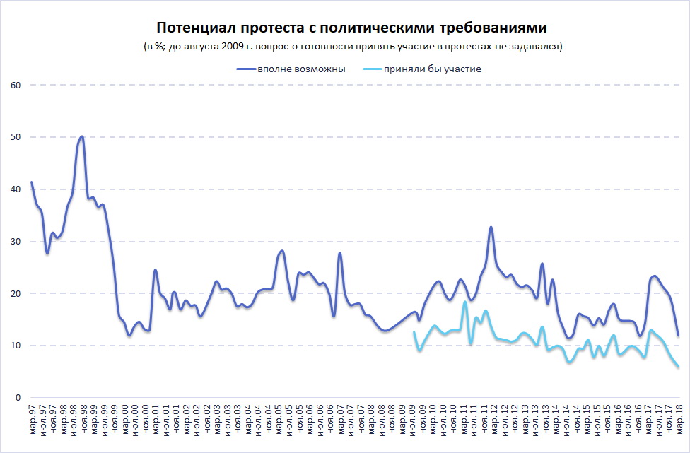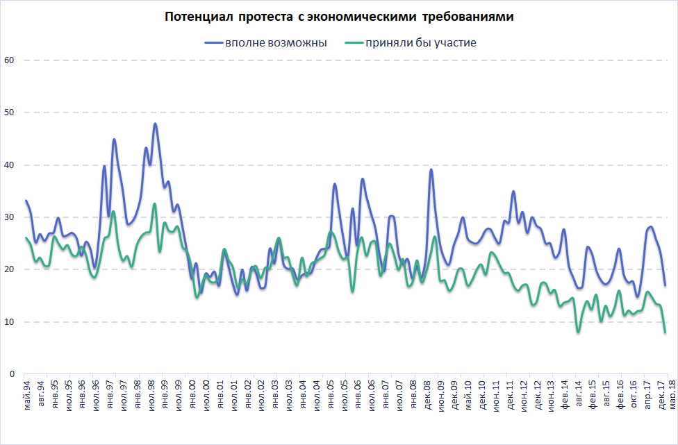 У березні 2018 року 75% жителів Росії назвали малоймовірними масові виступи населення проти падіння рівня життя, на захист своїх прав. Про свою готовність брати участь у таких акціях повідомили 8% громадян, а 86% заявили про те, що брати участь не збираються.