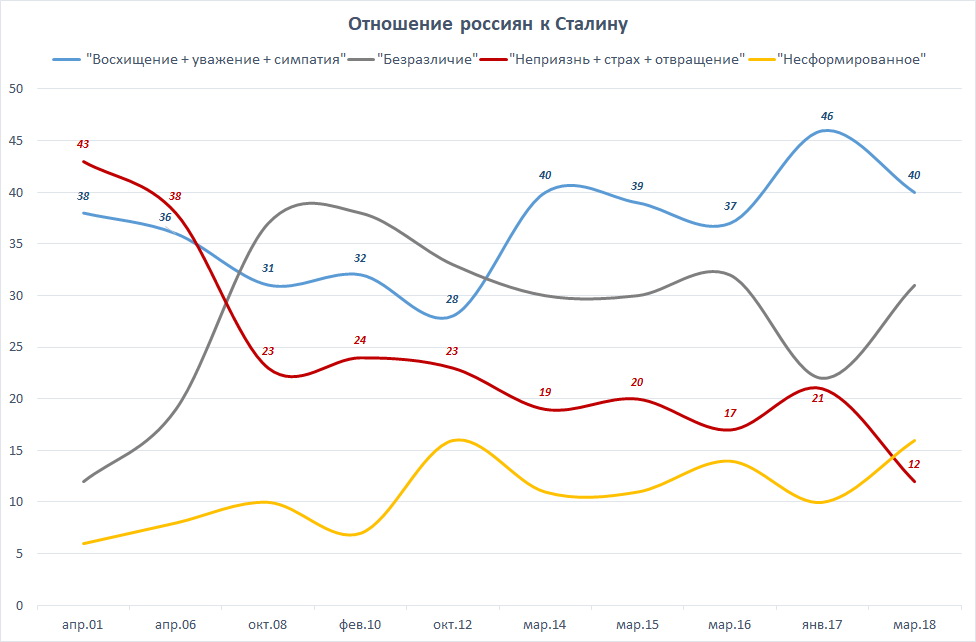 У березні 2018 року позитивні почуття (захоплення, повагу і симпатію) до Йосипа Сталіна відчували 40% жителів Росії, 12% - негативні (ворожість, страх, відраза), свідчать дані опитування "Левада-центру".