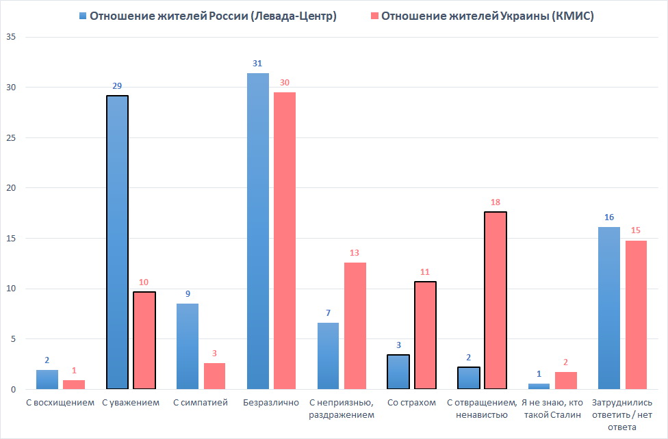 Як свідчать дані опитування КМІС, проведеного в лютому 2018 року, ставлення до Сталіна між жителями Росії і України істотно розрізняється. Якщо серед перших 40% опитаних відчувають до нього позитивні почуття, а 12% – негативні, то серед других відзначається зворотна пропорція – 14% проти 42%. При цьому частки респондентів, нейтрально налаштованих до вождя або вагалися відповісти, практично ідентичні.
