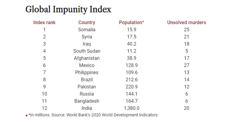 У 226 з цих випадків, або 81%, КЗЖ зафіксував повну безкарність, тобто жодна людина не була засуджена за вбивство. За попередній індексний період (з 1 вересня 2010 р. до 31 серпня 2020 р.) КЗЖ встановив, що 83% вбивств журналістів залишилися нерозкритими, що є продовженням недавньої тенденції до повільного прогресу у розкритті справ. У всьому світі у 2020 році щонайменше 22 журналісти стали жертвами вбивства на помсту за свою роботу, що більш ніж удвічі більше, ніж у 2019 році.