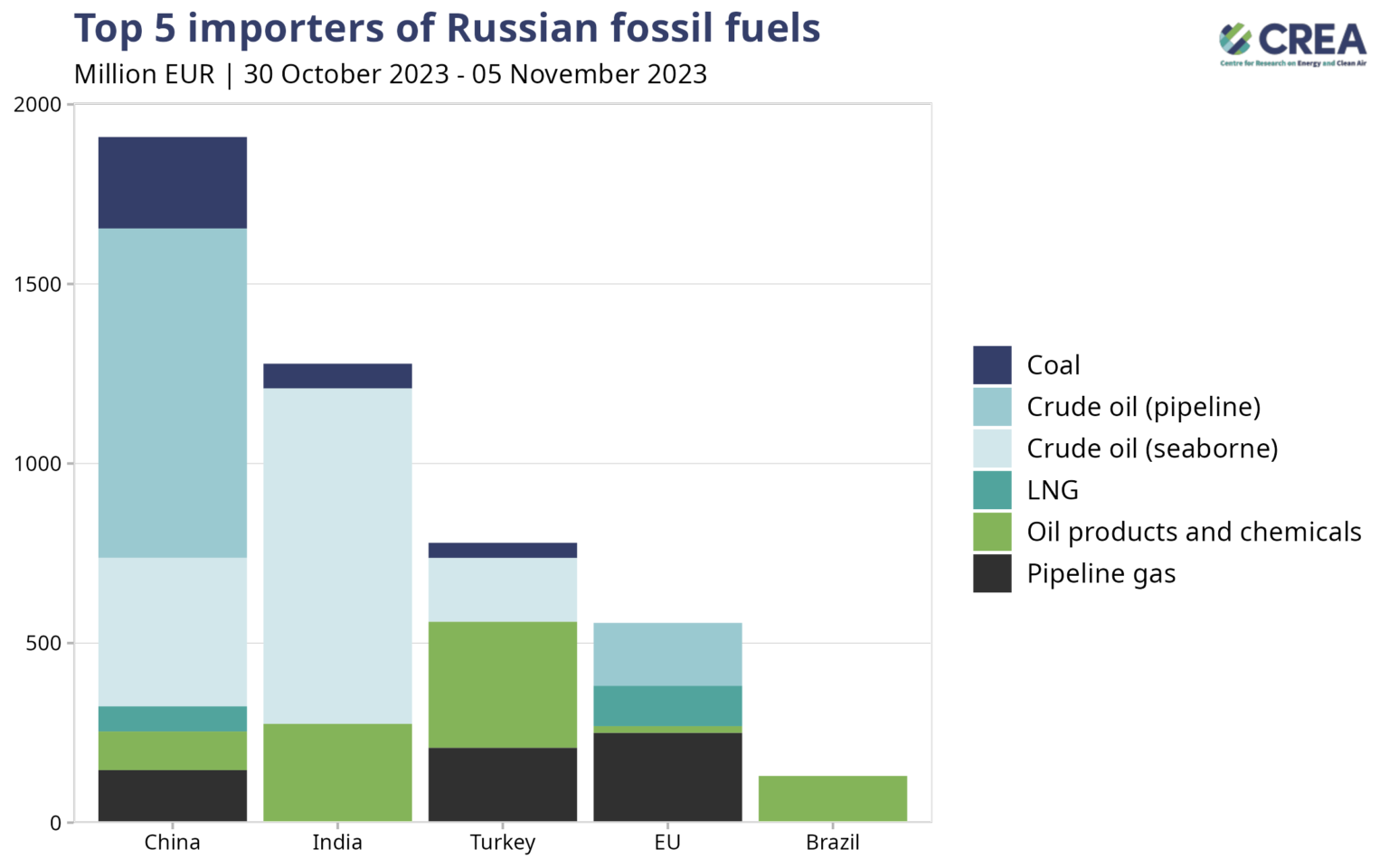Продукція на 1,94 млрд євро була завантажена на танкери, що належать або застраховані європейськими країнами, що допомогло профінансувати російське вторгнення в Україну. До п'ятірки найбільших імпортерів тижня 30.10-5.11 увійшли Китай, Індія, Туреччина, ЄС та Бразилія, зазначають у CREA.