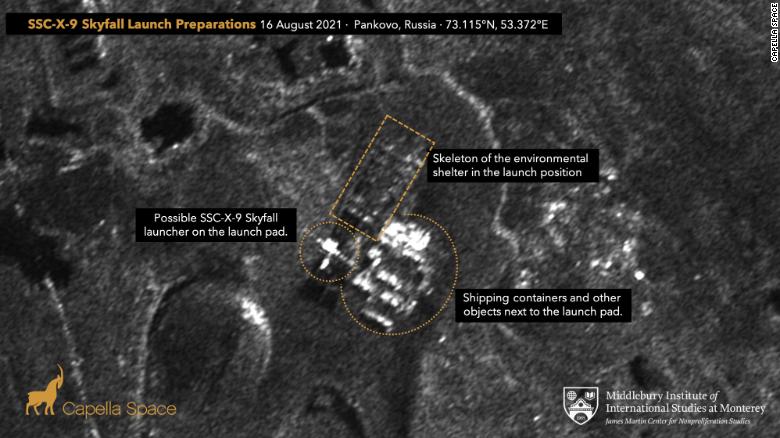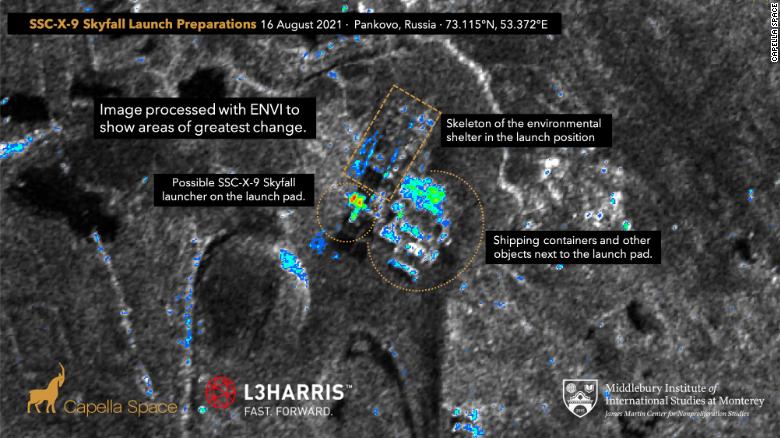 На знімках від 16 серпня 2021 року ймовірного стартового майданчика "Буревісника" в російській Арктиці, на архіпелазі Нова Земля, зафіксували ангар, який можна швидко збудувати, що спорудили, ймовірно, навколо "Буревісника". Також на дані із супутників показали багато контейнерів.