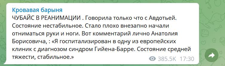 Запис починається зі слів про те, що Чубайс потрапив у реанімацію. "Говорила щойно з Авдотьєю. Стан нестабільний. Стало погано раптово почали відніматися руки та ноги", - пише Собчак. Вона також навела, за її словами, особистий коментар самого Чубайса про госпіталізацію до однієї з європейських клінік із діагнозом синдром Гійєна-Барре. "Стан середньої тяжкості, стабільний", - йдеться у тексті.