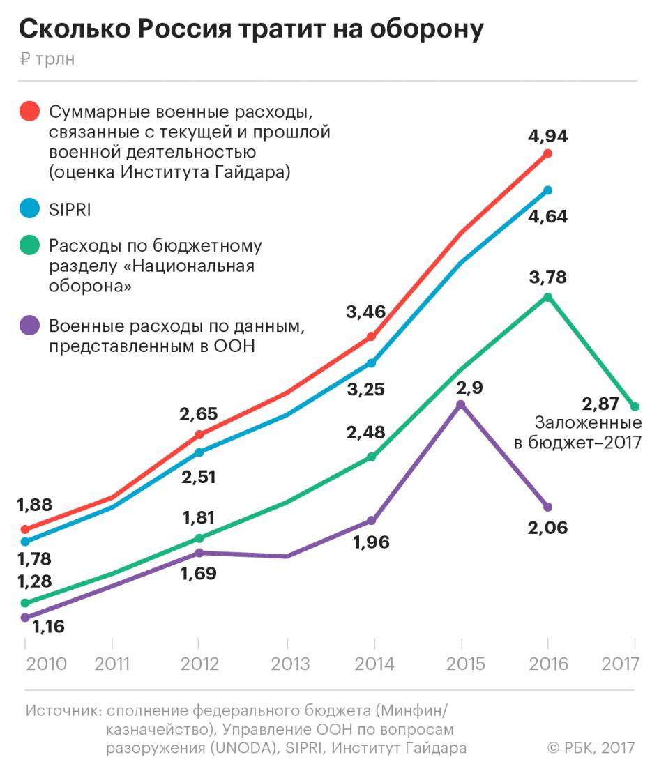Називається й інша сума, більш висока, ніж офіційно закладено в бюджеті. Її розрахував завідувач лабораторією військової економіки Інституту Гайдара Василь Зацепін. Згідно з цими розрахунками, військові витрати РФ склали майже 5 трильйонів рублів, в які входять також "непрямі" витрати, формально знаходяться в інших статтях бюджету. Розбіжності пояснюються тим, що багато які витрати відносяться до закритих бюджетних витрат. Зазначається, що витрати на особовий склад російських збройних сил і воєнізованих структур в 2016 році виросли більш ніж в два рази, а витрати на закупівлі і будівництво скоротилися вчетверо.