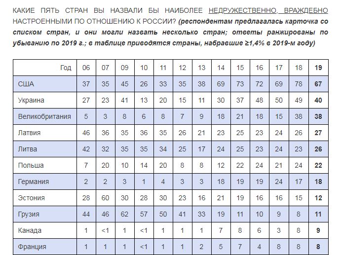 Водночас, за даними соціологів, перша трійка "ворогів" за рік не змінилася, до неї входять США, Україна та Великобританія. Також у п'ятірку увійшли Латвія і Литва.