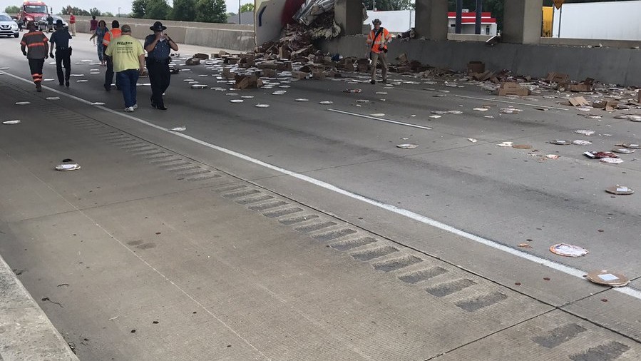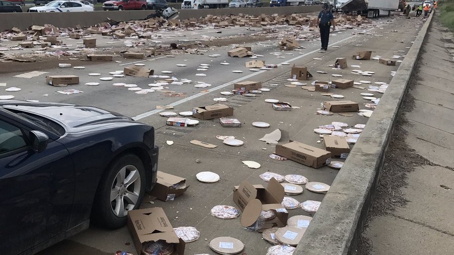 "18-колісна вантажівка, яка перевозила піцу, зачепила опору моста, в результаті чого причіп розрізало і їжа розсипалася по дорозі навпроти будівлі департаменту управління наземного транспорту Арканзасу", - уточнюється в повідомленні.