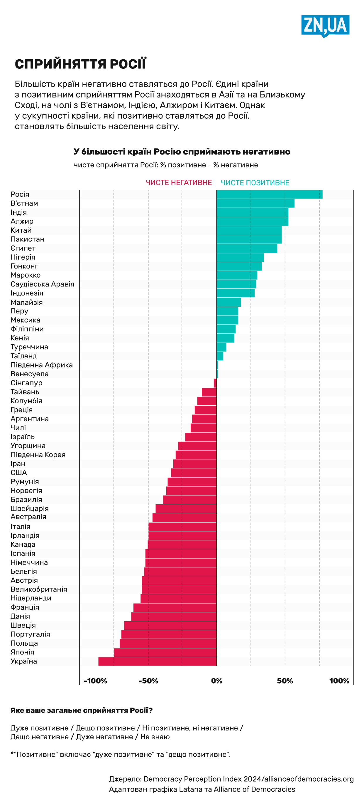 Банальне «нічого особистого, просто бізнес», — відповідь більшості країн Глобального Півдня на докори щодо байдужого ставлення до війни Росії проти України та продовження співпраці з агресором. Досить просто поглянути на діаграми оприлюдненого в травні 2024 року нового дослідження «Індекс сприйняття демократії», проведеного в 52 країнах, які чітко демонструють поділ світу залежно від ставлення до економічного співробітництва з Росією й Китаєм.
