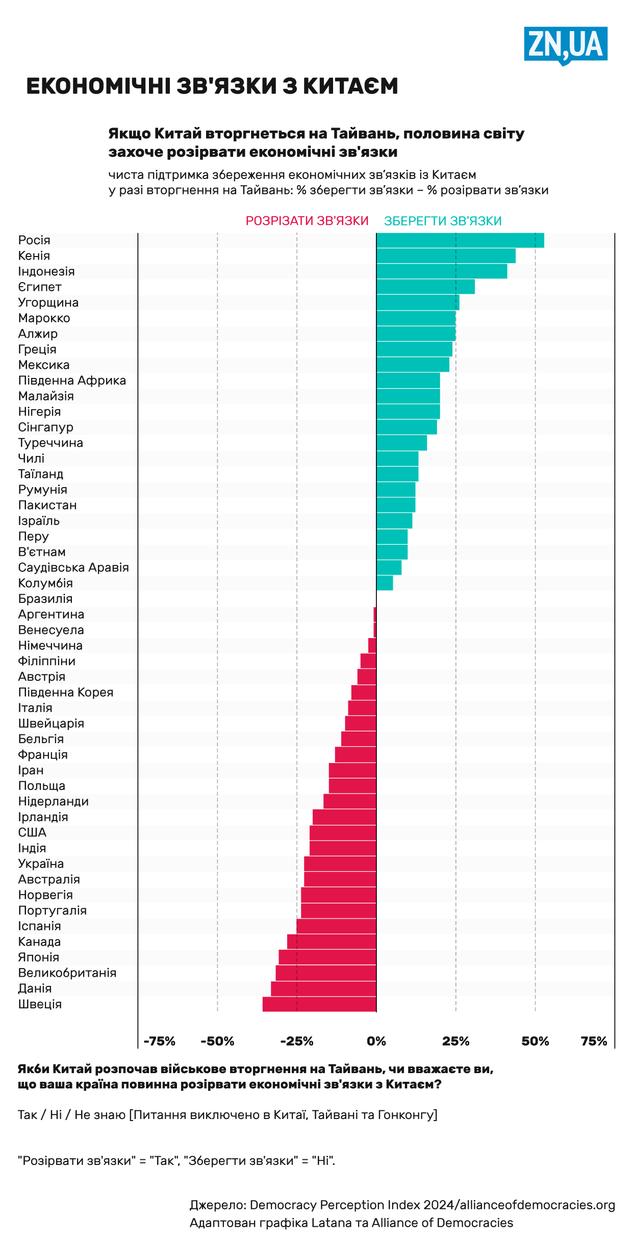 Такою ж є відповідь громадян половини опитаних країн і на запитання, чи підтримують вони збереження економічних зв’язків із Китаєм у разі його вторгнення на Тайвань.