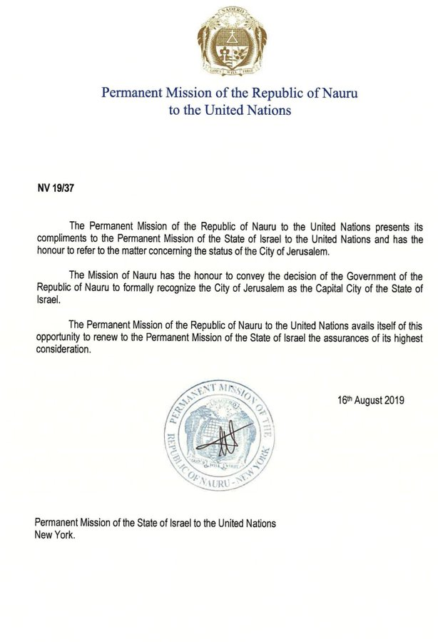 У листі місії країни при ООН в Нью-Йорку, адресованому ізраїльській місії по цьому питанню, зазначається: "Місія Науру має честь передати рішення уряду Республіки Науру про офіційне визнання міста Єрусалим як столиці держави Ізраїль".