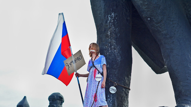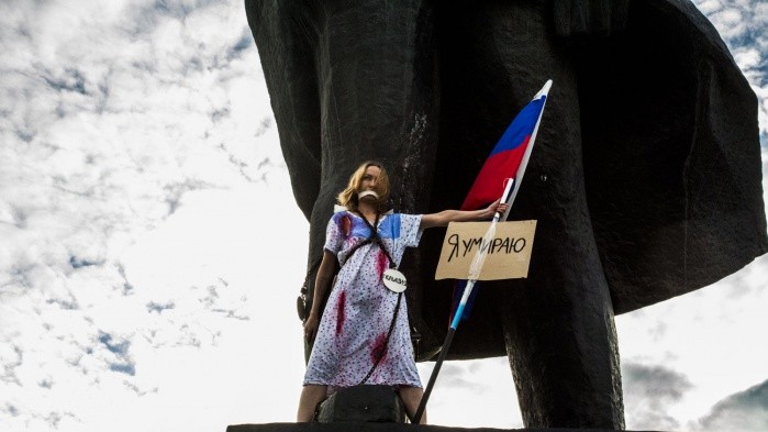 Для свого одиночного пікету дівчина одягла розірвану сорочку, забруднену червоною фарбою. В руках у неї була табличка з написом "Я вмираю". На себе і на ланцюг вона прикріпила картонні таблички з написами "поліція", "страх", "корупція", на обличчя наділу пов'язку, що уособлює цензуру. Як пояснила дівчина кореспонденту, її образ уособлює Росію, прикуту до забутого минулого. З зав'язаним ротом і з прапором Росії в руках вона символізувала вмираючу країну: одиночний пікет дівчина приурочила до Дня державного прапора РФ.