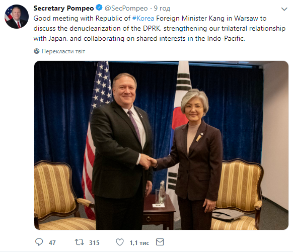 "Відбулася добра зустріч з міністром закордонних справ Південної Кореї Кан Ген Хва у Варшаві, щоб обговорити денуклеаризацію КНДР", - написав Помпео.
