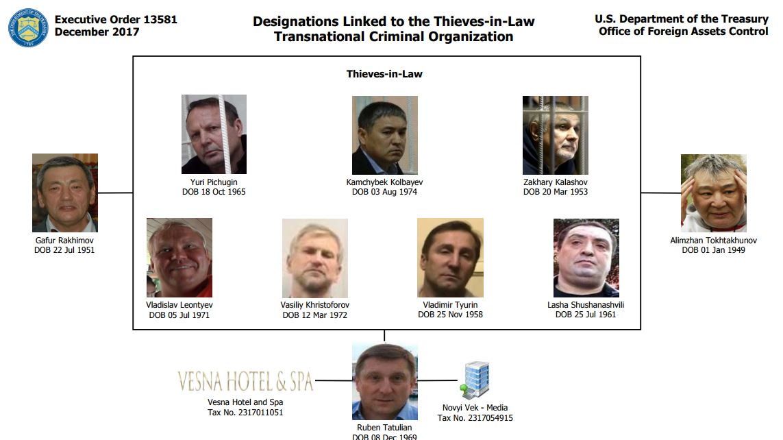 Під американські санкції потрапили: Захар Калашов (Шакро-Молодий), Василь Христофоров (Воскрес), Камчибек Колбаев (Камчі Бішкекський), Лаша Шушанашвілі (Лаша Руставський), Владислав Леонтьєв (Вадик Білий), Юрій Пічугін (Пичуга), Володимир Тюрін (Тюрик), Гафур Рахімов, Алімжан Тохтахунов (Тайванчик) і Рубен Татулян (Робсон).