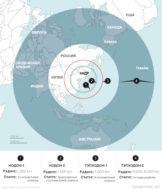 Американський аналітичний центр Stratfor представив дані про діапазон ураження північнокорейськими ракетами. За даними центру, зараз в бойовій готовності перебуває ракета Тепходон-1, яка може вражати цілі на відстані 2 тисяч кілометрів від місця запуску.
