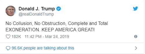 Президент США Дональд Трамп назвав підсумки розслідування спеціального прокурора Роберта Мюллера щодо можливого втручання Росії до президентських виборів США у 2016 році, оприлюднені генеральним прокурором США Вільямом Барром, "повним виправданням", написавши про це у своєму Twitter.