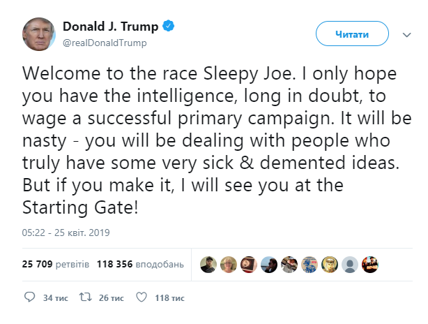 Президент США Дональд Трамп прокоментував намір колишнього віце-президента США, члена Демократичної партії Джо Байдена балотуватися в президенти США в 2020 році, написавши про це 25 квітня у Twitter.