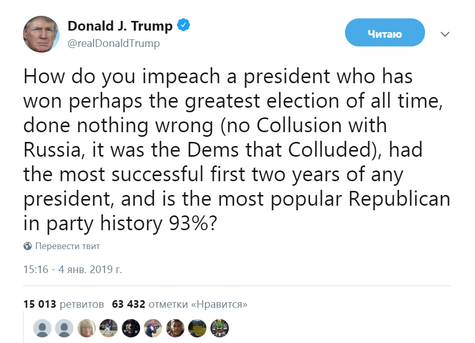 "Яким чином можливо оголосити імпічмент президенту, який виграв, може бути, найбільш значні за весь час вибори, не зробив нічого протизаконного (не брав участь у змові з Росією, а демократи брали участь), був успішним два роки на посаді президента і є найбільш популярним серед республіканців за всю історію партії, маючи рейтинг схвалення 93%?", - заявив він.