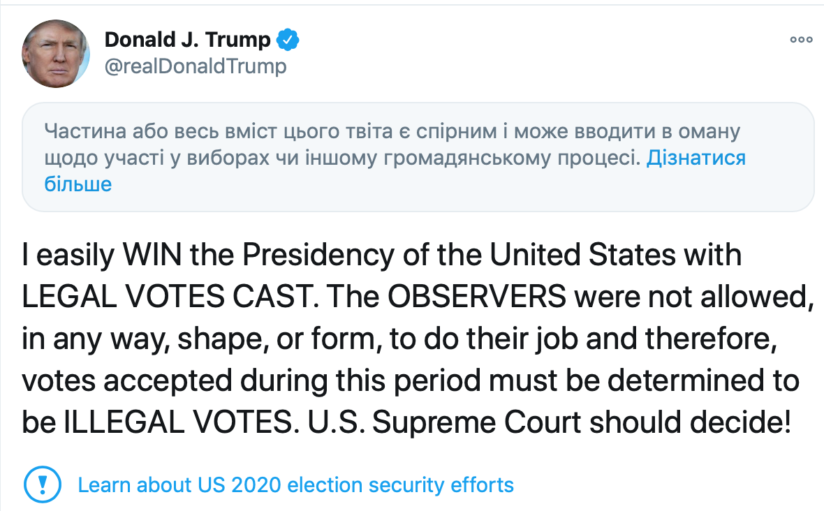 "Я з легкістю виграю президентські вибори Сполучених Штатів, (якщо враховувати) легально подані голоси. Спостерігачам не було дозволено яким-небудь шляхом робити їх роботу, і, отже, голоси, подані в цей період (в ході поштового голосування), повинні вважатися незаконними голосами", - написав Трамп на своїй сторінці в Твіттер.