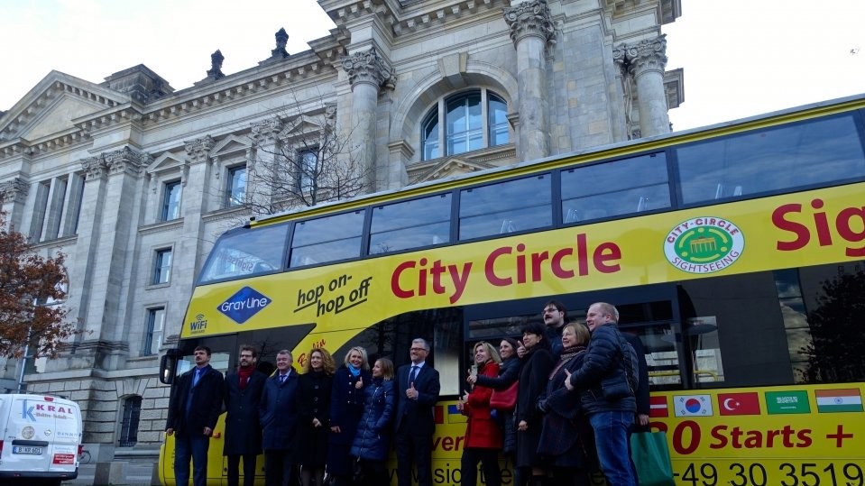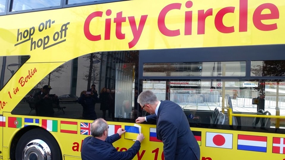 У всіх 30 берлінських екскурсійних автобусах "Berlin City Circle" тепер можна дізнатися про визначні пам'ятки німецької столиці українською мовою. Посол України в Німеччині Андрій Мельник та керівник туристичного підприємства Міхаель Грефе урочисто наклеїли український прапорець на перший такий автобус, передає Укрінформ.