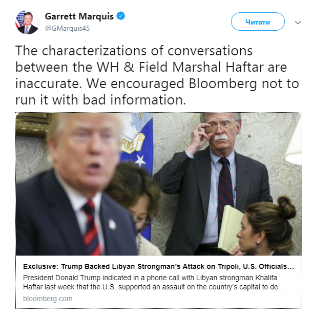 Публікація видання Bloomberg, у якій говориться, що під час телефонної розмови президента США Дональда Трампа і лівійського маршала Халіфи Хафтара американський лідер підтримав бунтівного лівійського воєначальника, не відповідає дійсності, написав представник Ради національної безпеки Білого дому Гаррет Маркі в своєму Twitter 24 квітня.