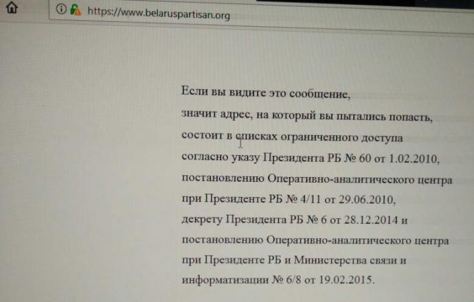 Міністерство інформації Республіки Білорусь заблокувало сайт "Білоруський партизан" за "поширення забороненої інформації". Рішення ухвалили 14 грудня в рамках здійснення контролю за дотриманням законодавства про засоби масової інформації.