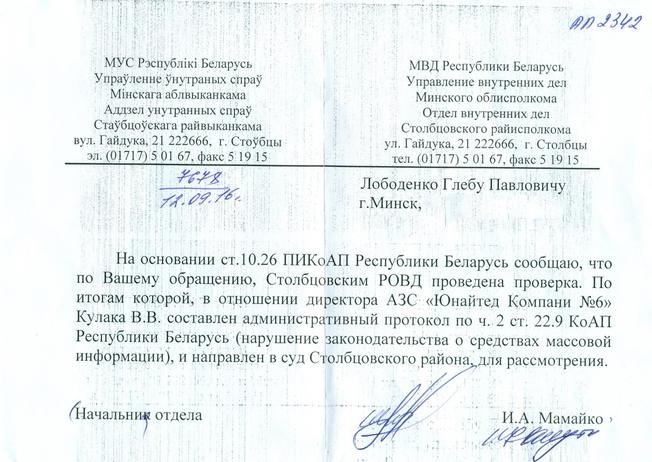 Видання уточнює, що скандал навколо трансляції телеканалу "Росія 24" стався на одній із АЗС. Журналіст Гліб Лободенко попросив перемкнути канал "Росія 24", але співробітники відмовилися, пославшись на наказ директора показувати саме цей телеканал. У відповідь журналіст звернувся в Міністерство інформації, Міністерство зв'язку. У Мінінформації відповіли, що показувати "Росії 24" протизаконно не тільки на заправці, а взагалі в Білорусі. Більш того, його немає і в офіційному переліку з 209 іноземних телеканалів, які мають дозвіл на поширення в Білорусі.
