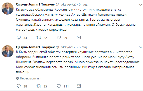 "У Кизилординській області зазнав аварії вертоліт міністерства оборони. Виконував польот у рамках військового навчання за маршрутом Актау-Шимкент. Екіпаж вертольота загинув. Мною наказано почати розслідування. Мої співчуття сім'ям загиблих. Їм буде надано матеріальну допомогу", - написав він.