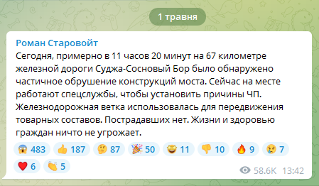 «Сьогодні, приблизно об 11 годині 20 хвилин на 67 кілометрі залізниці Суджа-Сосновий Бір було виявлено часткове обвалення конструкцій мосту. Наразі на місці працюють спецслужби, щоб встановити причини НП», - написав він.