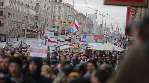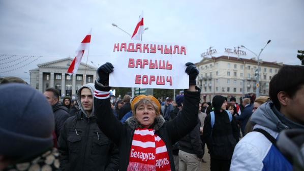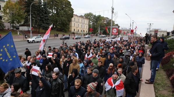 10 жовтня учасники несанкціонованої білоруськими властями опозиційної акції "За вільні справедливі вибори" організували мітинг після завершення майже трикілометрової ходи по головному проспекту Мінська.