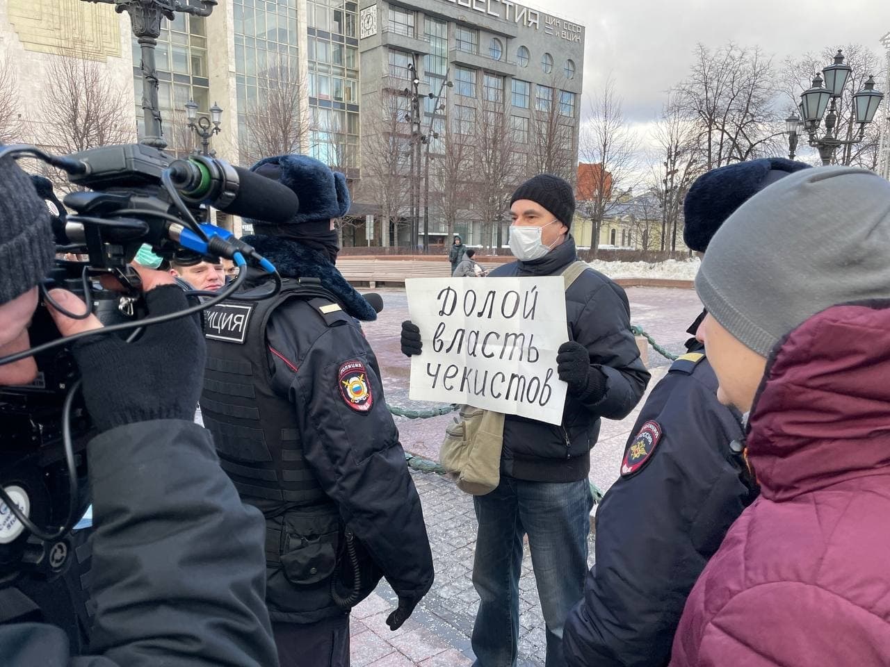 Подія відбулася 20 лютого на Пушкінській площі. Люди, які брали участь в акції, тримали плакати з написами: "Школи та лікарні замість бомб і снарядів", "Руки геть від України", "Геть владу чекістів", "Росія, не чіпай Україну", "Ні війні з Україною", "Свободу" українським політв'язням".