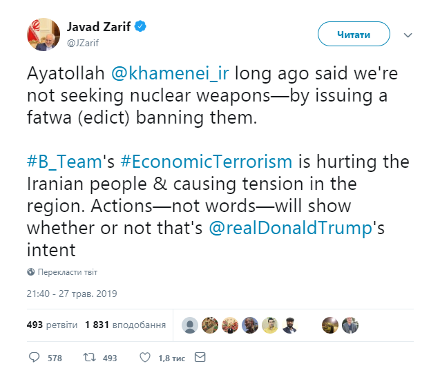 Іран не прагне розробити і отримати ядерну зброю, а США просто нагнітають обстановку на Близькому Сході, написав в понеділок, 27 травня, міністр закордонних справ Ірану Джавад Зариф у своєму Twitter.