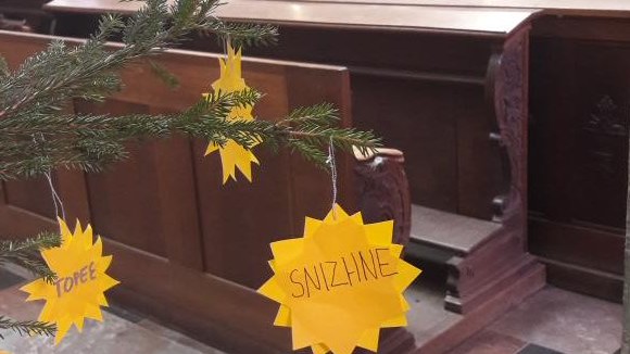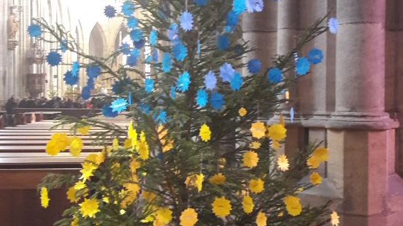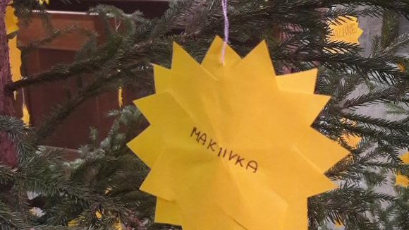 Ялинка стоїть у празькому Соборі святого Віта - головному соборі країни. Її прикрашають паперові зірки кольорів українського прапора з написаними назвами окупованих міст Донбасу. Зокрема, Горлівка, Макіївка, Сніжне - які, наголосив Перебийніс - незабаром будуть звільнені: "Дякуємо за підтримку! Вони обов'язково будуть звільнені. Слава Україні! З Новим роком!" – написав український посол.