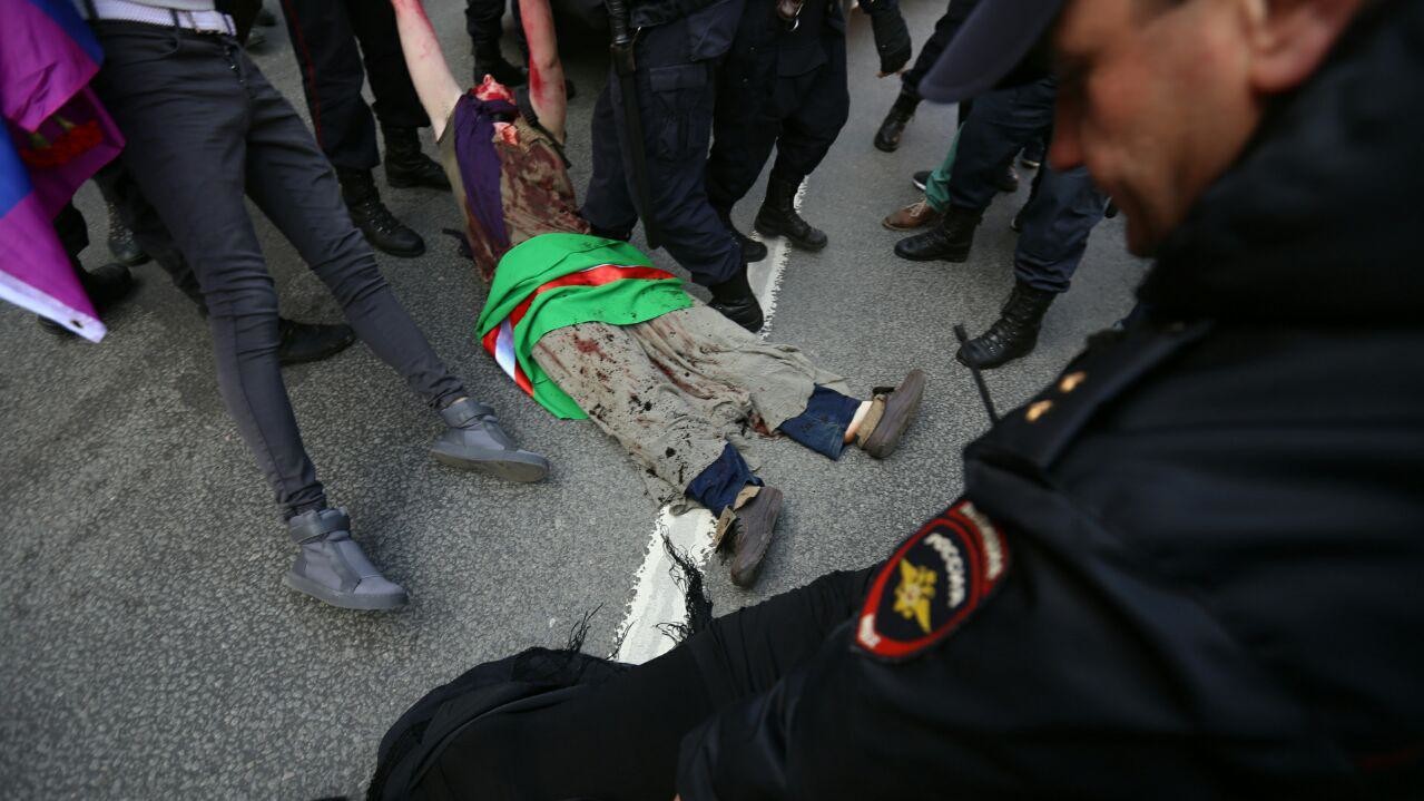 "Активісти провели перфоманс, в якому чеченські матері оплакували і посипали землею своїх дітей. Лежачі на землі закривавлені тіла ЛГБТ-людей були вкриті райдужними і чеченськими прапорами. Акція була покликана висловити солідарність з жителями Чеченської республіки, а також звернути увагу на жахливі події, які відбуваються там зараз", - пояснили зміст заходу активісти. В ході міні-акції молоді люди у фарбі, яка зображала кров, лежали на асфальті, загорнуті у прапори ЛГБТ. Поруч сиділа дівчина і кричала.