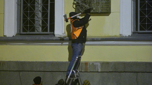 На учасниках "акції" були жилетки з абревіатурою "НБ" - забороненої в Росії націонал-більшовицької партії. Дошку кілька разів вдарили сокирою, однак суттєвих пошкоджень заподіяти не змогли.